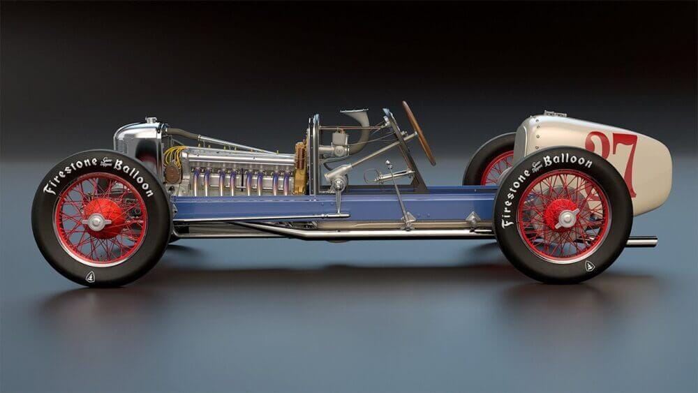 Criar uma réplica em tamanho real do carro nº 10 na série de tração dianteira dos planos Miller / Goosen / Offenhauser originais, como o da corrida de 1929. O carro real está nos estágios iniciais de construção. Esse modelo 3D que você vê aqui no post serviu de pré-montagem para a equipe de restauração e forneceu uma solução para resolver dúvidas sobre a construção do carro. O modelo foi construído e renderizado no Modo v12.2