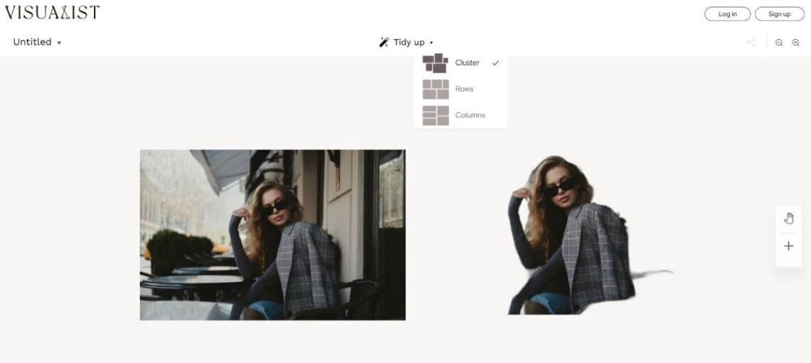 Depois de enviar suas imagens para o Visualist, você pode optar por manter o estilo de forma livre ou pedir ao aplicativo para organizar automaticamente as imagens em uma grade. Dependendo de sua escolha, a ferramenta “Arrumar” irá organizá-los em um cluster, linhas ou colunas,