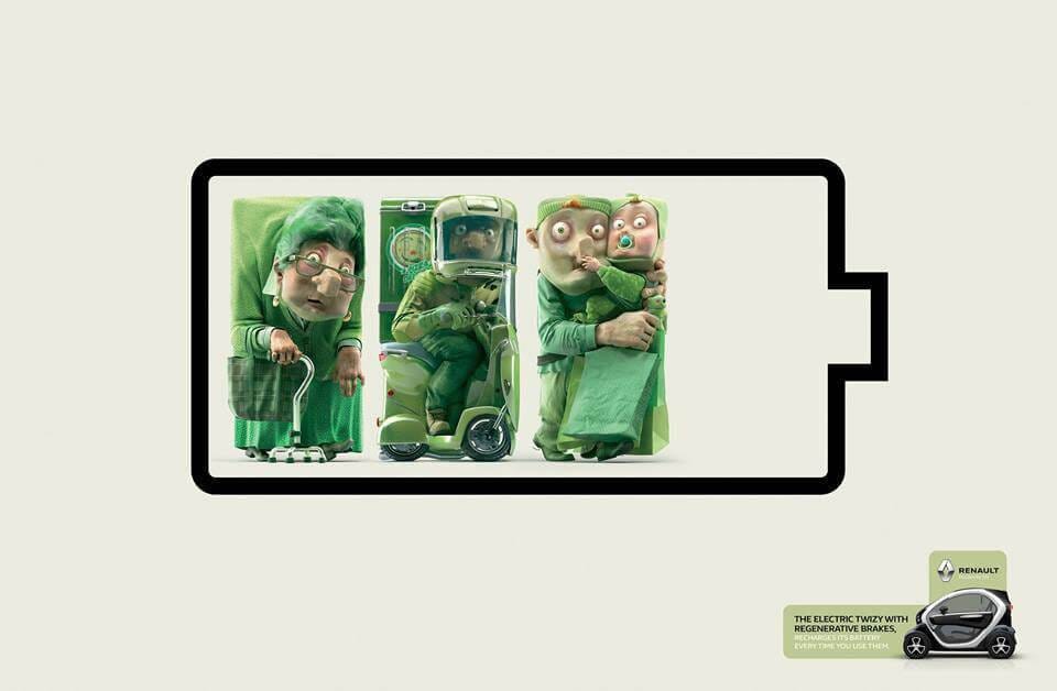 O Twizy, carro elétrico da Renault, vem com freios regenerativos que, a cada freada, usam a energia gerada para carregar um pouquinho mais a própria bateria. A criação é da Marcel e mostra, literalmente, os motivos de cada freada transformados em acúmulo de carga. As ilustrações ficaram por conta da ótima “Carioca Studio:, de Bucareste, na Romênia.