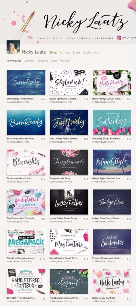 Em 2012 Nicky Laatz abriu sua lojinha online dentro do Creative Market, onde passou a vender suas fontes e templates, que fazia de casa. Ela criou uma linha de manuscritos que fizeram muito sucesso e que acabaram virando até embalagens e com isso faturou o equivalente a US1.000.000 em 4 anos. Fiz uma conta rápida aqui e se não calculei mal, são R$ 3.100.900,00 em 48 meses. Daria um “salário” de R$64.600,00. Sem precisar enfrentar trânsito e do aconchego do seu lar.