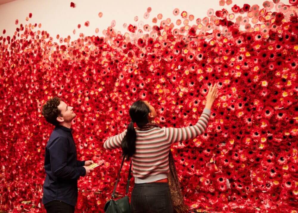 Na exposição “Flower Obsession”, na Galeria Nacional da Trienal de Victoria, os convidados receberam margaridas gerbera artificiais e adesivos de flores para colocar em qualquer superfície à sua escolha, cobrindo completamente o local até o final da temporada de quatro meses.