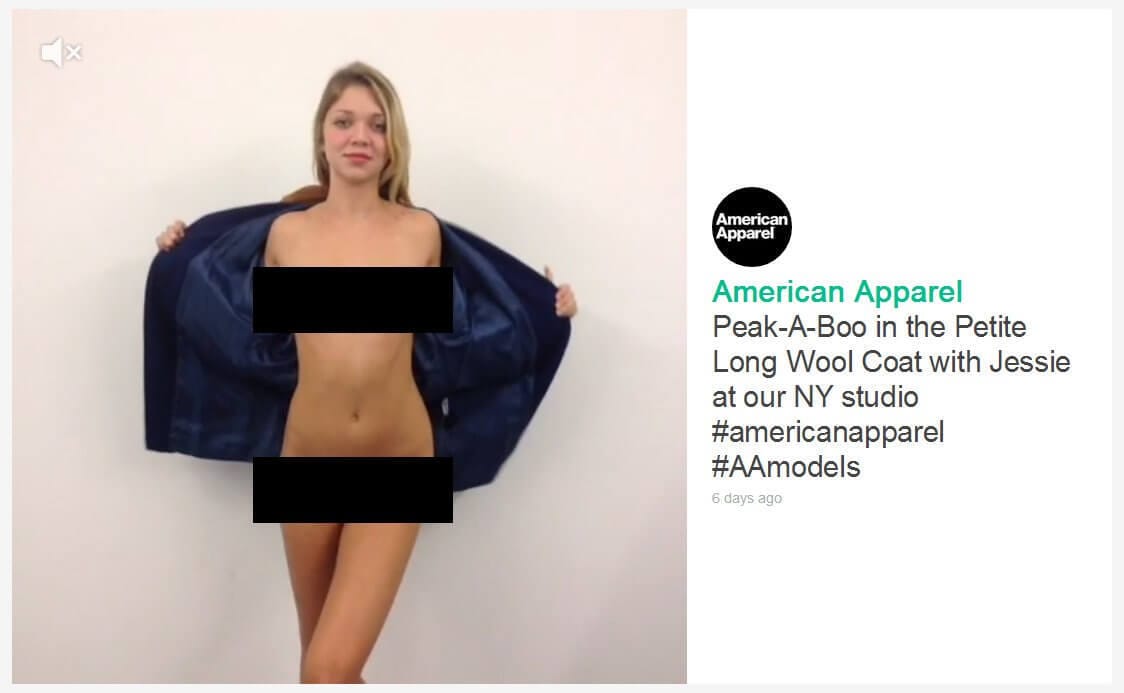 Provavelmente para ganhar mídia espontânea e ampliar a audiência do seu canal dentro do Vine, a marca American Apparel – já conhecida pelo seu histórico de anúncios polêmicos – começou a publicar videos no Vine em que as modelos aparecem nuas.Nos comentários dos vídeos surgiram algumas críticas, mas a marca – famosa por ousar sempre – provavelmente deve persistir com a estratégia. É possível ver os dois vídeos já lançados a partir desse link, e esse outro (não esqueça que esses links apresentam imagens de nudez e conteúdo inapropriado para menores!).