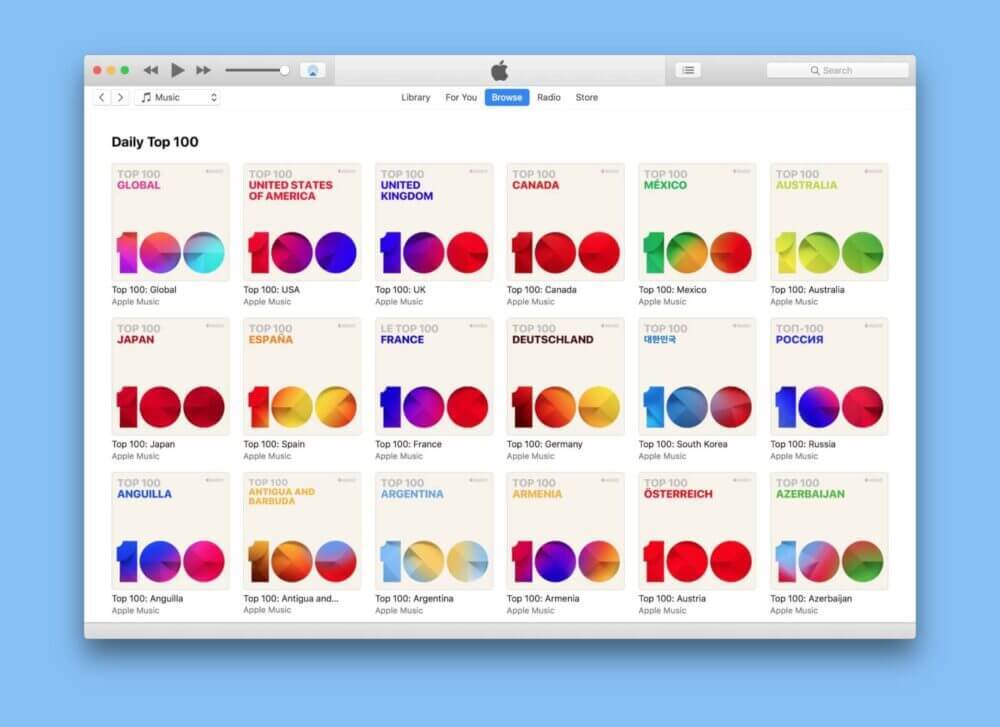 A Apple Music tem uma série de TOP 100, com playlists divididas por países. São várias. Desde os países maiores como os Estados Unidos até países bem menores, como o Azerbaijão, o Bahrain ou a Armênia.