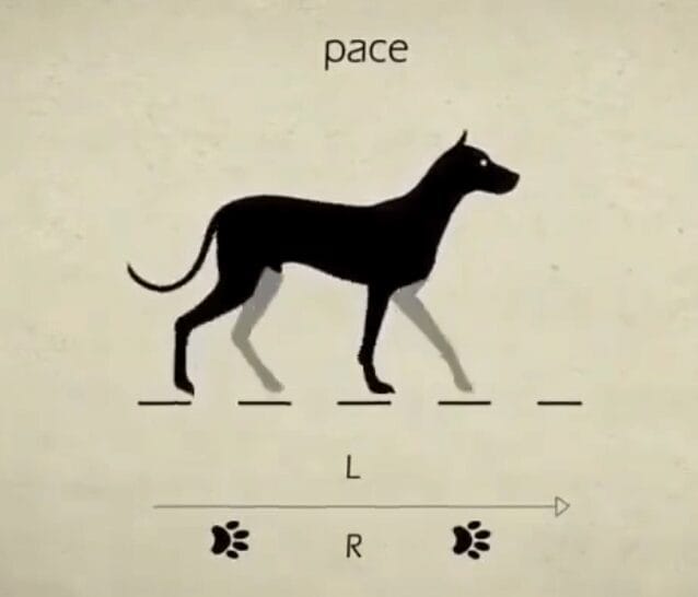 Já os cachorros, entre outros quadrúpedes, têm uma cadência bem mais diversificada e elaborada, como mostra o gráfico animado acima. Caminham, trotam, galopeiam. Repare nas pegadas na parte inferior para ver como administram as 4 patas.