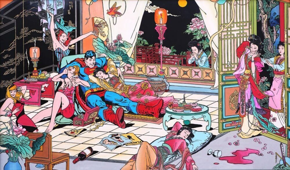 O em “The Harmonious Society”, o artista chinês Jacky Tsai combina imagens tradicionais chinesas com super-herois clássicos: Mulher Maravilha, Batman, Flash – criando uma narrativa sobre o encontro entre as culturas americana e chinesa através do poder das marcas.