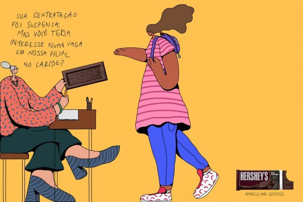 Criação da BETC/Havas para o chocolate meio amargo da Hershey’s, o “amargo, mas gostoso”, com ilustrações de André Ignatiuk mostrando situações que parecem “amargas”, mas que na verdade são muito boas.