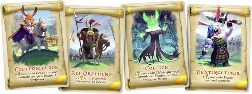 Entre os tipos de cartas estão as de território, que indicam onde colocar um coelhinho; as de construção, que permitem criar edificações ou recursos em áreas dominadas; provisões, que entregam duas cartas extras; e pergaminhos, com modificadores na pontuação ao fim do jogo.
