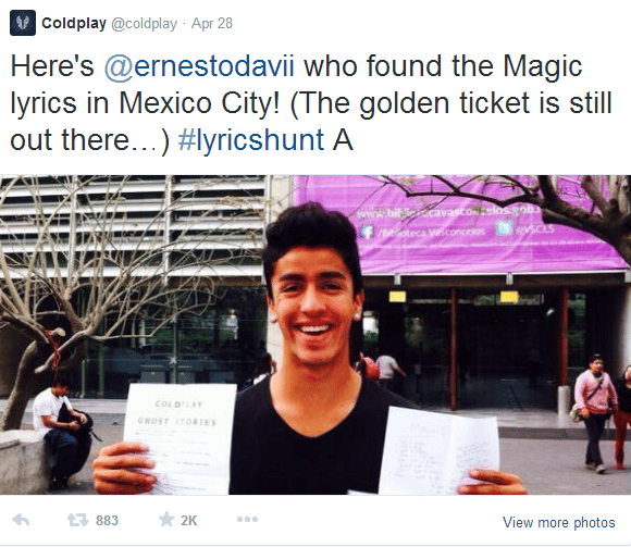 Chris Martin (Coldplay) separou-se de Gwyneth Paltrow, produziu um novo álbum e para seu lançamento, preparou um “caça ao tesouro” pelas letras das músicas – escritas à mão – que foram espalhadas por bibliotecas do mundo todo. A primeira estava numa biblioteca da Cidade do México.