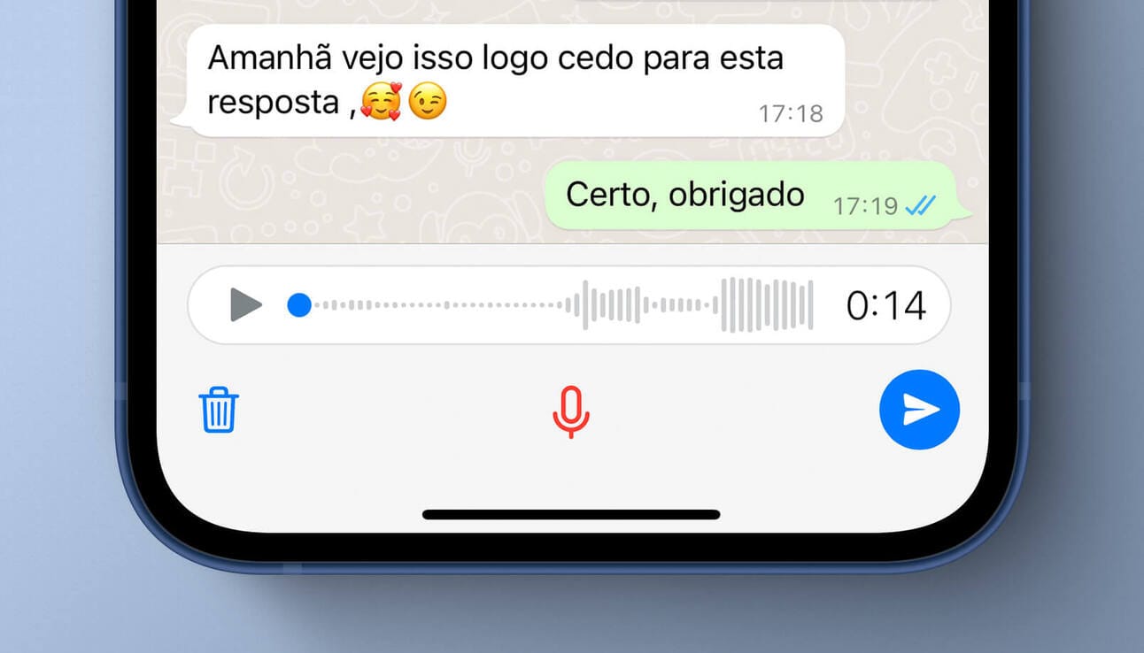 Se estiver tudo conforme você deseja, aí então é só tocar no botão azul para enviar a gravação para o seu contato. Se você não gostou do que ouviu e quiser refazer, basta tocar no ícone de lata de lixo e iniciar todo o processo novamente.