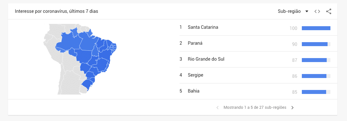 Baseado nos dados do Google Trends, além de gráficos comparativos em outros países, a plataforma serve como hub dos temas mais pesquisados por aqui.