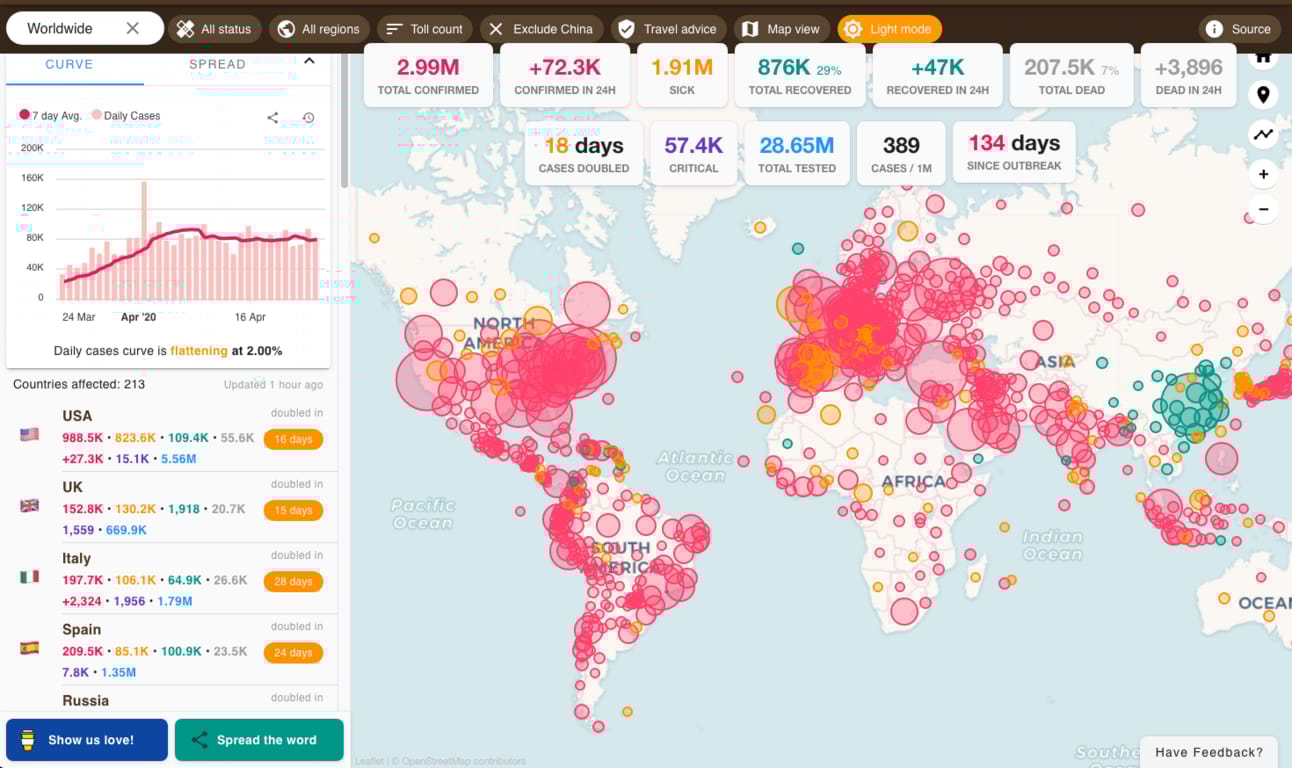 O site Coronavirus Tracker 2.0 é mais uma boa opção de acompanhamento da evolução da pandemia. Apesar de utilizar os números reportados pelos países, uma métrica que tem se mostrado pouco confiável pela dificuldade de notificações realistas, pelo menos as comparações e curvas estão lá. Dá para saber, por exemplo, a taxa de dobra de casos, medida em dias. Países dobrando a cada 15 dias ou menos são considerados ainda em ascensão. O Brasil está dobrando a cada 10 dias.