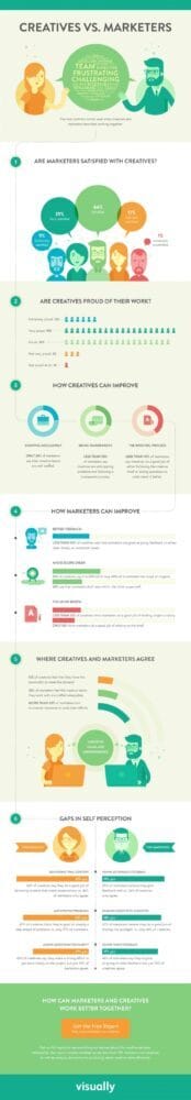 No ano passado o pessoal da Visualy conduziu um estudo (você pode fazer o download aqui) sobre a relação entre os profissionais de criação e os executivos de marketing, responsáveis pela aprovação de campanhas. O infográfico abaixo resumo os resultados que, embora reflitam os dados de uma realidade americana, servem como insight para qualquer um que faça parte dessa tão interessante relação.