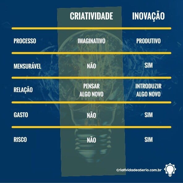 Além disso, podemos ver aqui uma relação de dependência. A Inovação depende da Criatividade para acontecer, enquanto o inverso não acontece. Ou seja, não há como ser inovador sem ser criativo, mas podemos ser criativos sem sermos inovadores. Capiche?