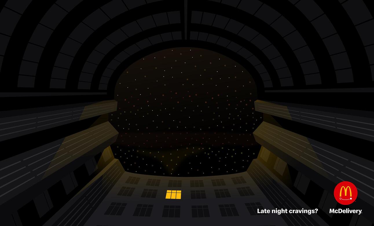 Campanha de OOH da DDB do Azerbaijão para o McDonald’s Delivery. O destaque é mais pela direção de arte, belo uso do contraste da escuridão da noite com as cores vibrantes da marca, bem funcional para painéis, principalmente a noite.