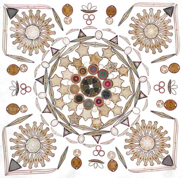 De acordo com a Wikipédia, diatomáceas são “São organismos unicelulares, e possuem como característica uma carapaça ou parede silicosa chamada frústula, localizada externamente à membrana plasmática.” Trocando em miúdos, esses pequenos organismos criam carapaças de vidro ao seu redor, e vêm em vários formatos e cores – o tamanho, por outro lado, é sempre mais ou menos o mesmo: só dá pra ver no microscópio.