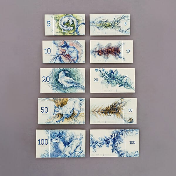 A designer Barbara Bernát de Budapeste criou uma moeda fictícia chamada de Euro-Húngaro que explora o que poderia ser uma evolução do papel-moeda na Hungria e no mundo. A característica mais inovadora é uma tinta especial que só aparece em ambientes iluminados com luz ultravioleta, mais conhecida como “luz-negra”. Assim, Barbara criou um efeito que mostra o esqueleto dos animais que estão estampados nas notas.