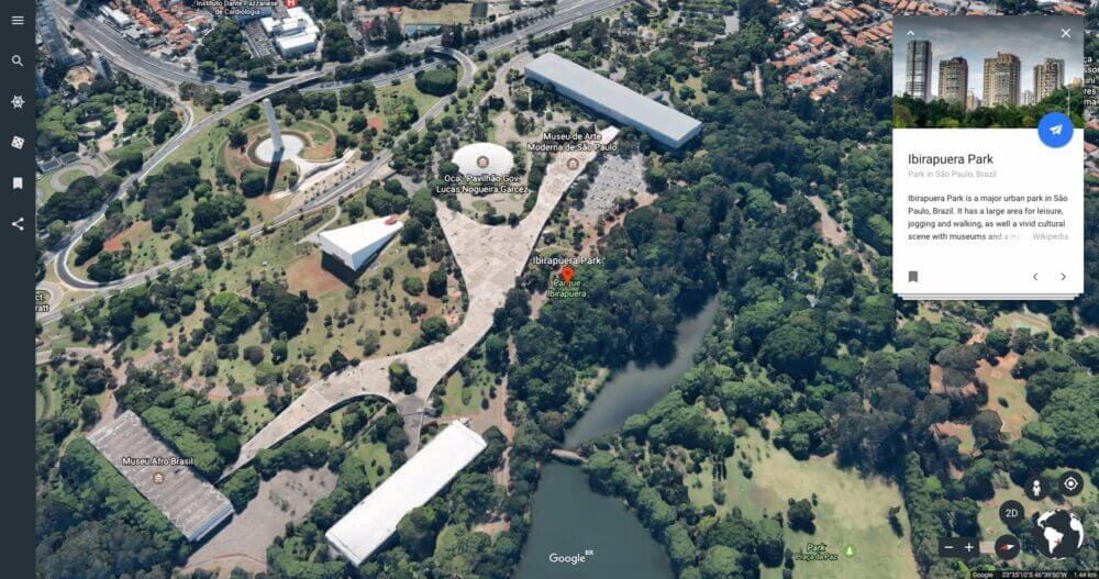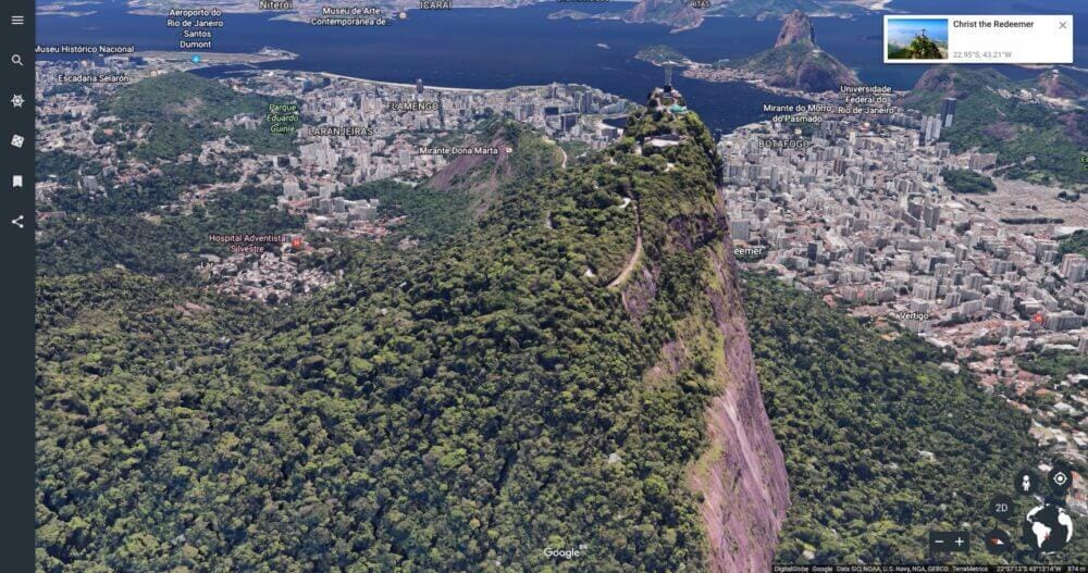Fazia tempo que eu não entrava no Google Earth, mas ontem dei de cara com essa notícia de uma nova versão e lá fui eu novamente. Agora dá para acessar diretamente do Chrome (ou dispositivos com Android), nem precisa instalar nada, nem abrir aplicativo nenhum, é só escrever “Google Earth” no seu navegador que você acha. Ou clica aí no link.