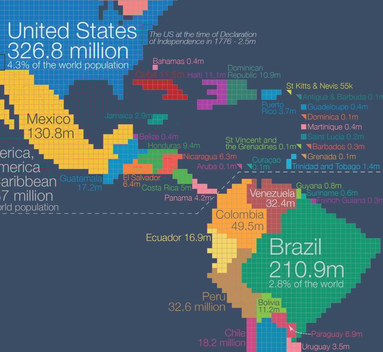 1 bilhão de pessoas vivem nas Américas. A América do sul parece não mudar tanto, apesar do Brasil ter um formato diferente. Na América do Norte, com uma densidade populacional de apenas 4 pessoas por km², o Canadá quase some do mapa, apesar de ser o segundo maior país do mundo em território.