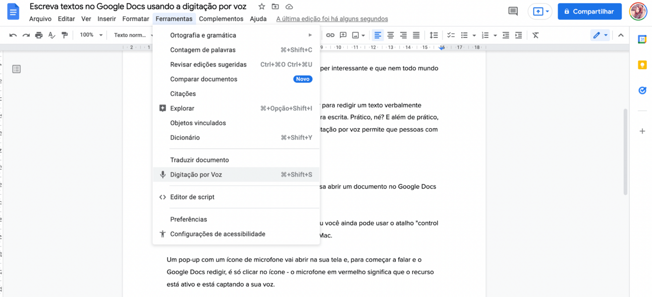 Além disso, o Google Docs ainda tem um recurso super interessante e que nem todo mundo conhece: a digitação por voz.