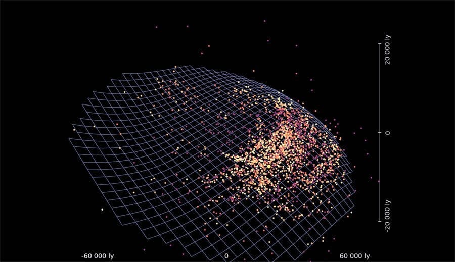 De forma bem resumida, o que esse mapa mostra são estrelas ultraluminosas chamadas “Cepheids”. Esse disco distorcido, em forma de espiral, é formado por elas. Ele foi obtido por meio de uma medição de distâncias diretas entre estrelas individuais – até agora, os melhores mapas da Via Láctea consideravam medidas indiretas, baseadas em observações de gás ou estrelas em uma determinada direção e estruturas vistas em outras galáxias. Essa medição de posições e distâncias de estrelas supergigantes conhecidas como “Cepheids” foi comandada por uma equipe da Universidade de Varsóvia, usando o telescópio Optical Gravitational Lensing Experiment, no Observatório Las Campanas, no Chile.