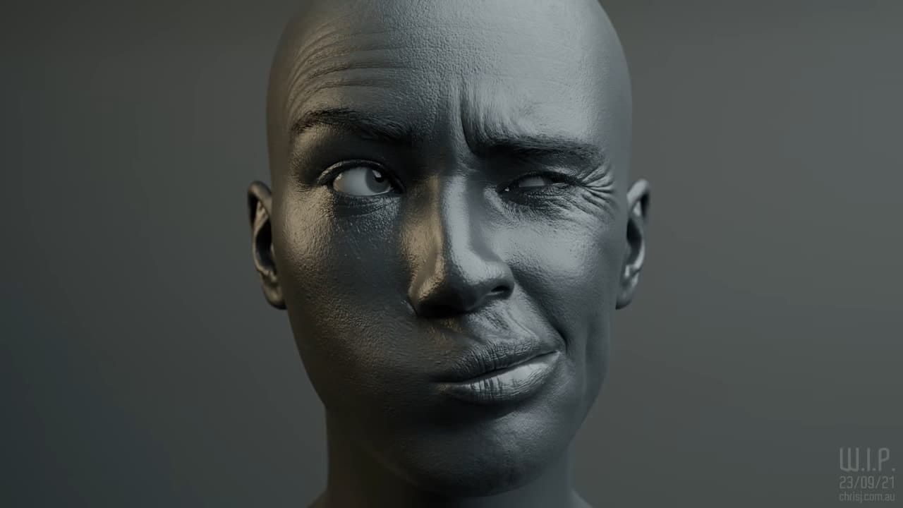 Não, não é uma pessoa de verdade. É um modelo feito manualmente no blender, com texturas, rugas e expressões faciais impressionantes.
