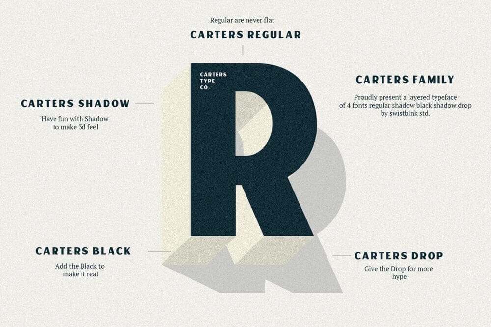 A família Old Carters vem com a Carters Regular, a Carters Shadow, a Carters Black Shadow e a Carters Drop para você fazer suas composições.