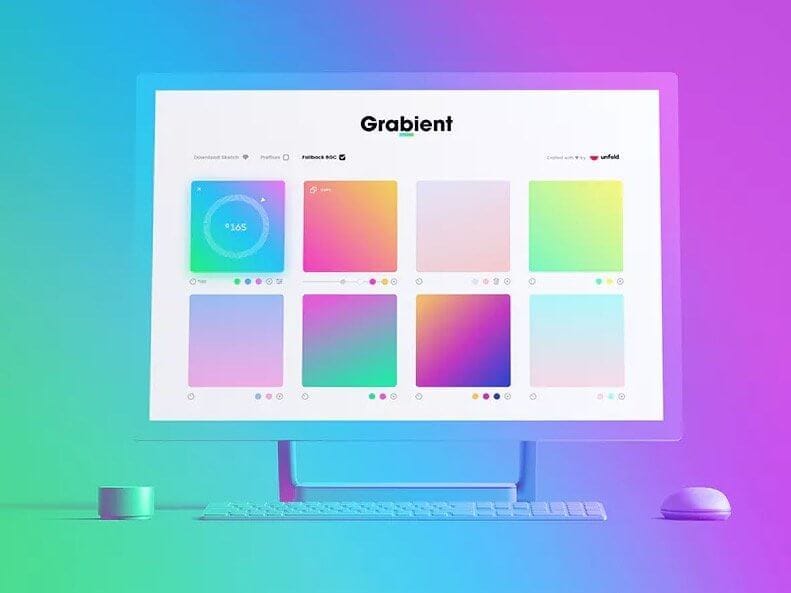 Grabient é um site com um grid com diversos exemplos de gradientes, que podem ser editados facilmente com alteração de cores, ângulos, predomínio de uma ou outra cor, tudo através de uma interface muito simples. E, depois que você criou seu gradiente perfeito, é só exportar o código CSS ou o arquivo para Sketch, para usar no seu design.