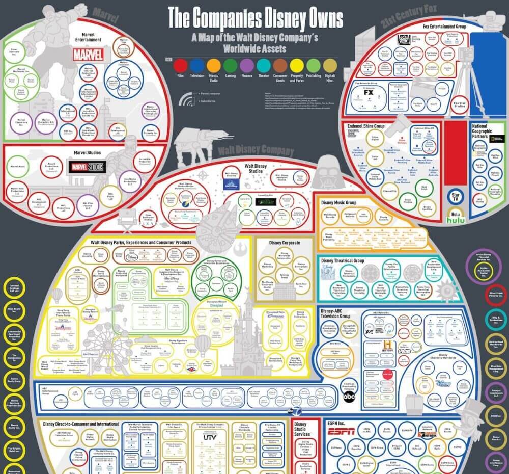 Com a compra de boa parte da FOX, a Disney passa a ser dona da Fox Family e Fox Animation, da Twentieth Century Fox, da Fox Searchlight Pictures e da Fox 2000 Pictures. E das unidades de produções para televisão: Twentieth Century Fox Television, FX Productions e Fox21. E também a FX Networks; a National Geographic Partners; Fox Networks Group International; Star India; parte do Hulu, Tata Sky, e o gigante e pioneiro dos reality shows, a Endemol Shine Group shows.