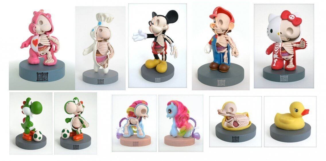 Jason Freeny é um artista, formado em desenho industrial e acabou se especializado em esculturas, action-figures e ilustrações feitas em computação gráfica. Ele é o dono da Moist Production Studio, onde produz artesanalmente suas obras, como sua famosa “arte anatômica”, com cortes em objetos e bonecos de personagens famosos para revelar suas anatomias. Dá para conferir o esqueleto e os orgãos da Barbie, do Mario, Do Sully e muitos outros. São feitos à mão e estão espalhados por aí em algumas coleções particulares de clientes também famosos como o Conan O’Brien, ou o presidente da Nike (Mark Parker). Custam entre US$ 1200 e US$ 8000 e são bem difíceis de serem comprados.