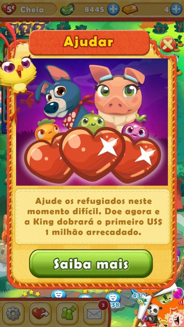 A empresa colocou um convite de doação na interface dos seus games e promete dobrar o primeiro milhão arrecadado. A tela a seguir é do game Farm Heroes (um dos meus favoritos da King.com) e mostra o anúncio.
