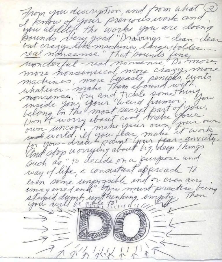 From your description, and from what I know of your previous work and your ability; the work you are doing sounds very good “Drawing — clean — clear but crazy like machines, larger and bolder… real nonsense.” That sounds fine, wonderful — real nonsense. Do more. More nonsensical, more crazy, more machines, more breasts, penises, cunts, whatever — make them abound with nonsense. Try and tickle something inside you, your “weird humor.” You belong in the most secret part of you. Don’t worry about cool, make your own uncool. Make your own, your own world. If you fear, make it work for you — draw & paint your fear & anxiety. And stop worrying about big, deep things such as “to decide on a purpose and way of life, a consistant [sic] approach to even some impossible end or even an imagined end.” You must practice being stupid, dumb, unthinking, empty. Then you will be able to