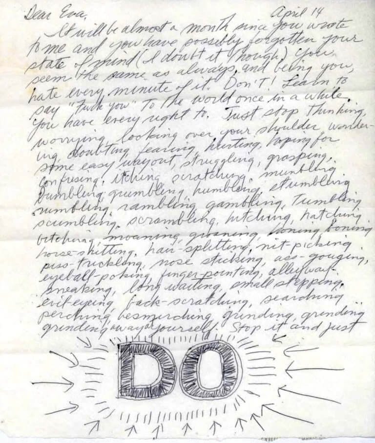 Eva estava passando por uma fase de “bloqueio criativo” e havia escrito ao amigo reclamando que não conseguia criar mais nada. O video é a resposta de Sol LeWitt, recomendando que ela parasse de pensar tanto e simplesmente partisse para a ação. E que o perfeccionismo mata a criatividade.