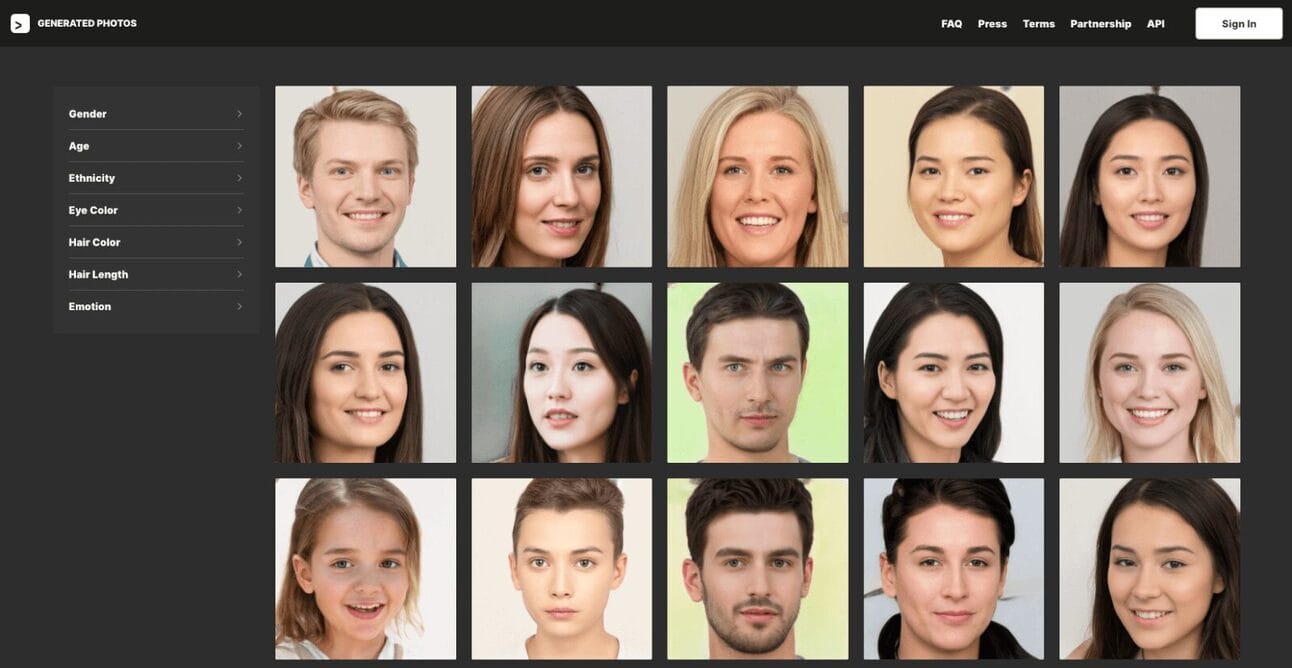 O Generated Photos API consegue gerar mais de 100.000 rostos de pessoas que não existem, porque são resultado de misturas de diversos modelos, de diversas idades e etnias. A vantagem é que assim você não precisa se preocupar com direitos autorais, licenciamento e contratos de modelos, renovações, conteúdos sensíveis, etc.