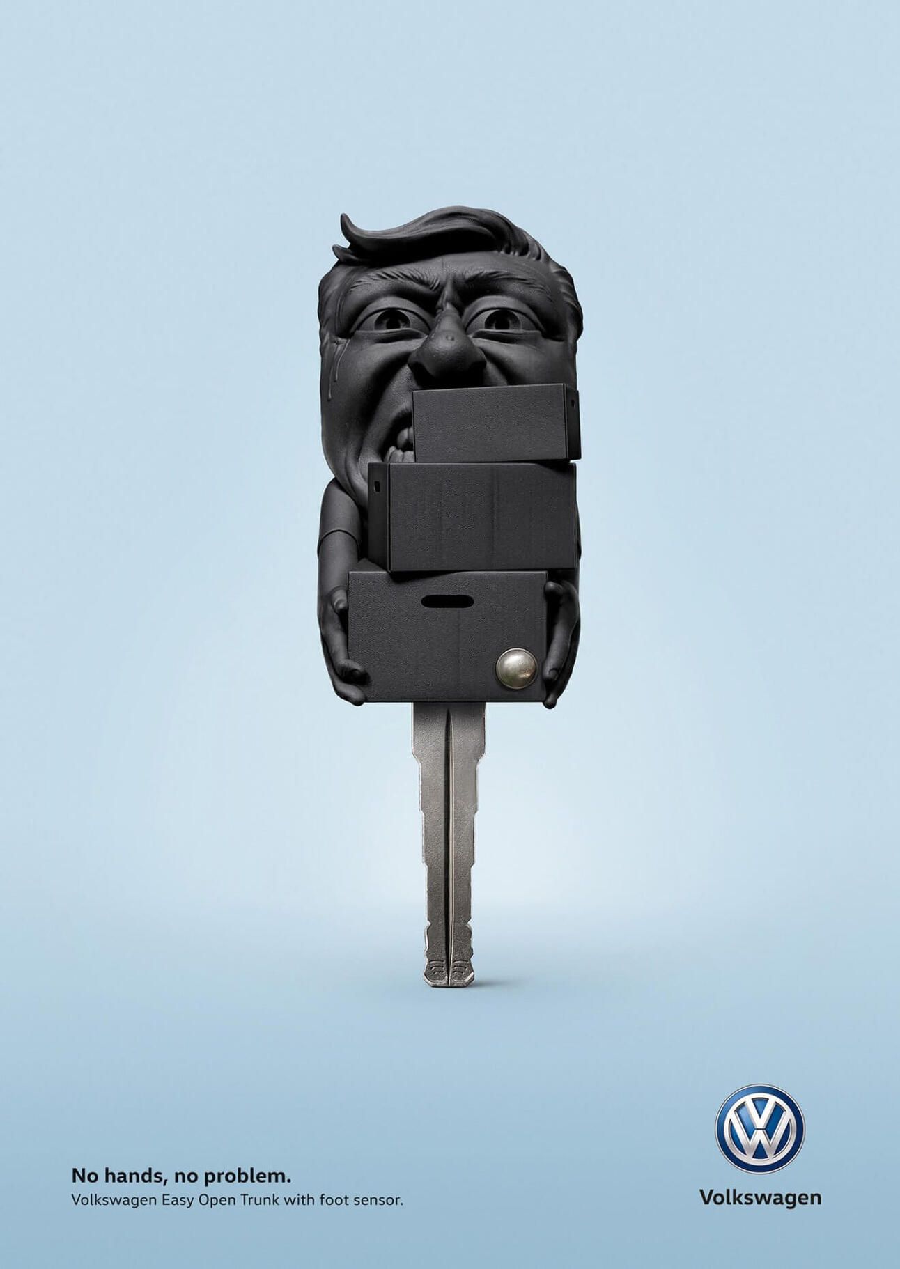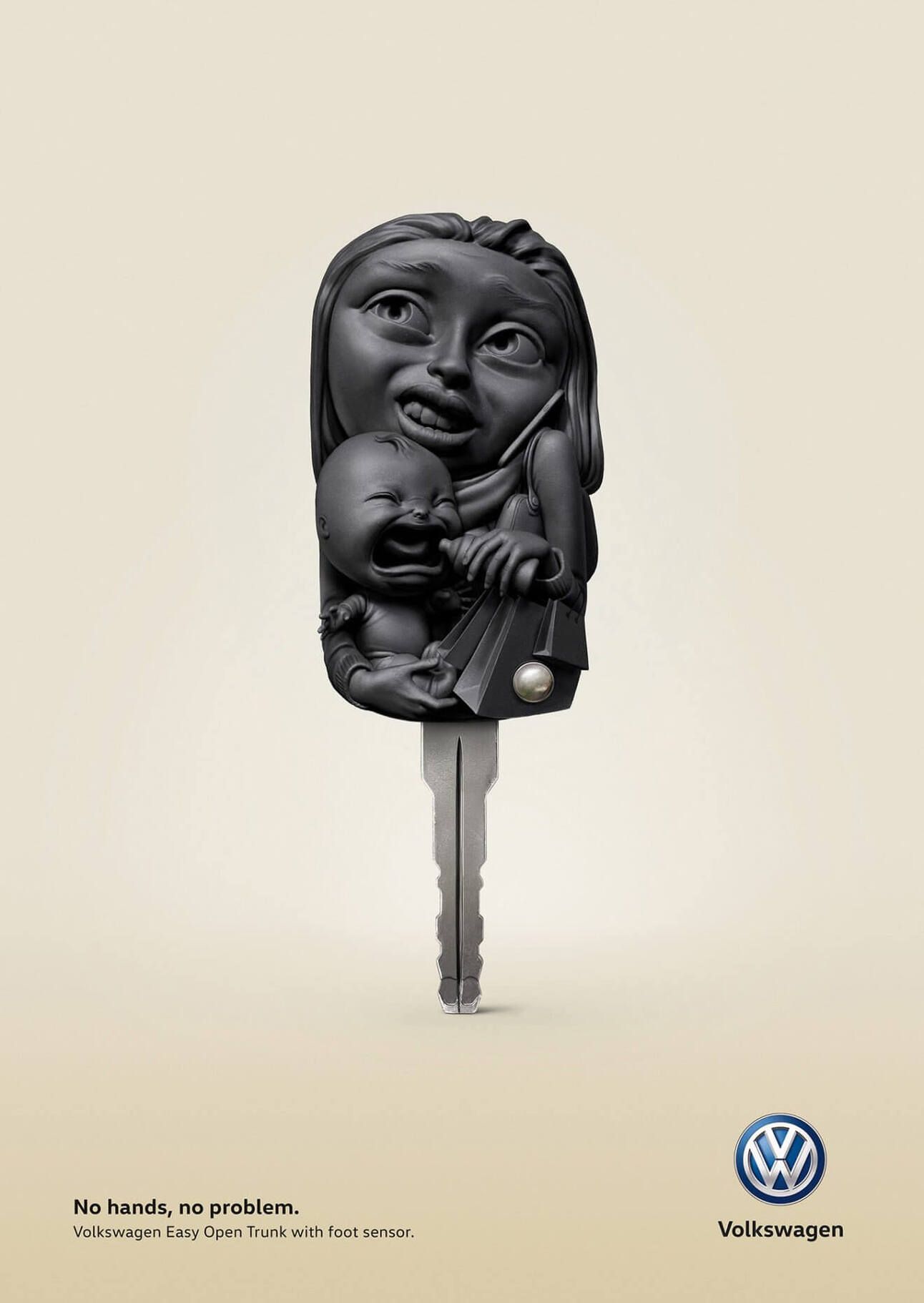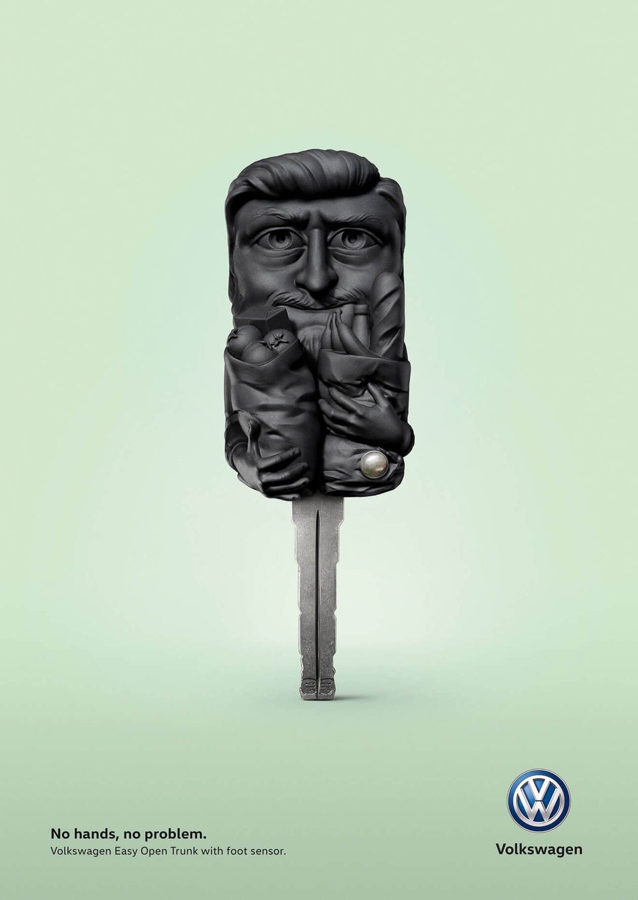 A solução de usar a chave do carro para ilustrar situações em que estamos com as mãos ocupadas demais para abrir o porta-malas é ótima. Mas o botãozinha na chave confunde um pouco chamando atenção para a solução errada, afinal não é ele que vai resolver o problema desta vez, mas sim um sensor abaixo do porta-malas que pode ser acionado com os pés. Tirando isso os anúncios são ótimos, com destaque para o trabalho do ilustrador Sattu.