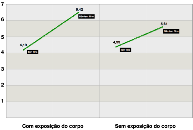 O gráfico abaixo mostra as notas médias dadas a esta modelo em cada uma das quatro situações possíveis (com ou sem exposição do corpo; com ou sem filhos):