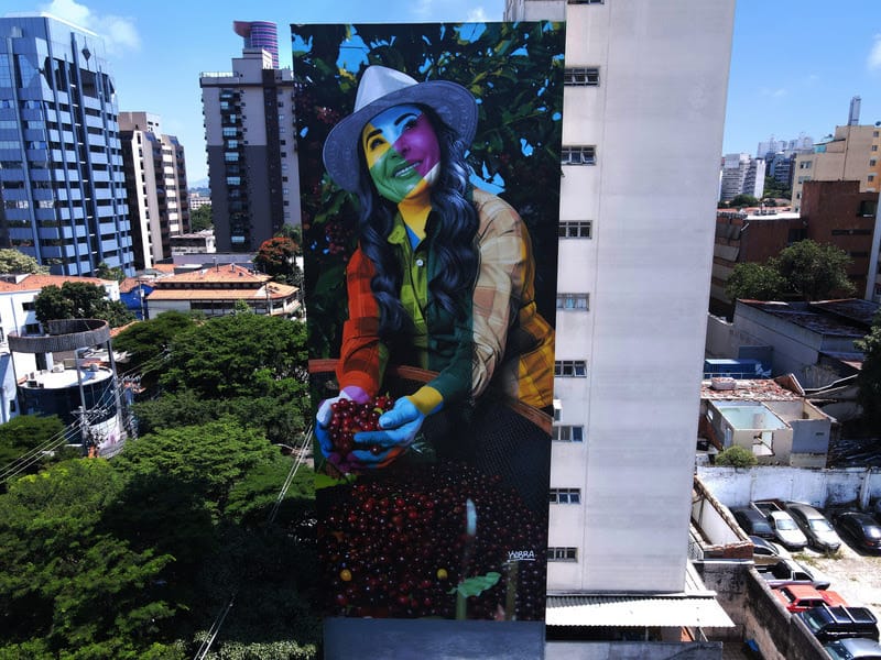 “Colheita”, a nova obra de Kobra, faz uma homenagem à cadeia do café e materializa o compromisso da marca com a sustentabilidade e o cuidado com as pessoas. O artista pretendeu representar a quebra de padrões no campo e se baseou na história de Lucimar Silva, Gestora Agrícola das Fazendas Guima Café, que fornecem café para a Nespresso.
