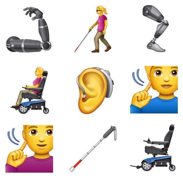 Dentre as principais novidades, está uma série de imagens para representar as pessoas com deficiência e itens de acessibilidade. Todas as imagens que representam pessoas ou partes do corpo possuem a opção de alterar o tom de pele. Também há duas imagens fofas de cão-guia e cão de serviço na seção de animais do aplicativo.