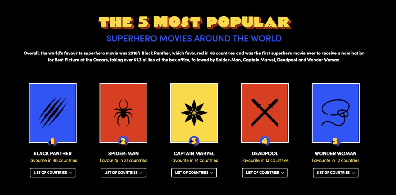 O site Cashlady lançou um infográfico que revela quais filmes de quadrinhos são mais populares em cada país do mundo.