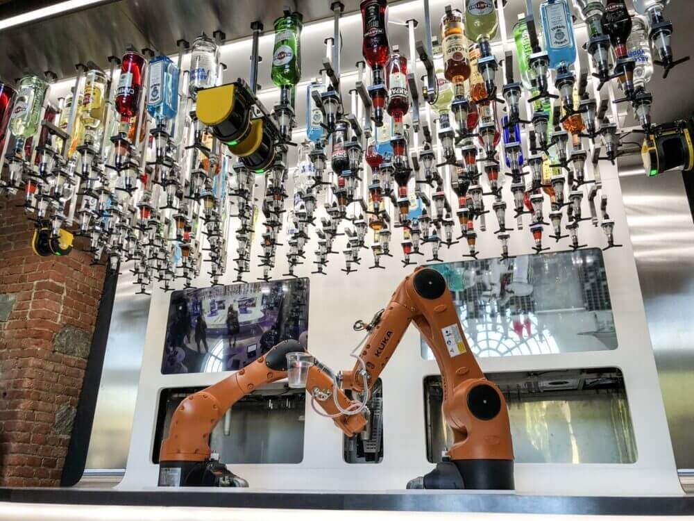 Com uma capacidade de misturar uma variedade infinita de coquetéis, usando até 170 garrafas de diferentes destilados, Guido conta com 2 braços mecânicos para preparar com precisão e servir qualquer bebida em segundos.