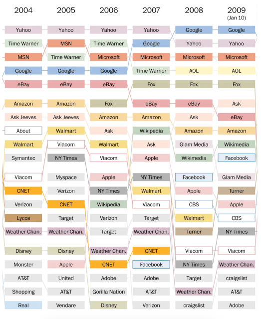 Interessante ver a evolução do tipo de site que lidera o ranking com o passar dos anos.