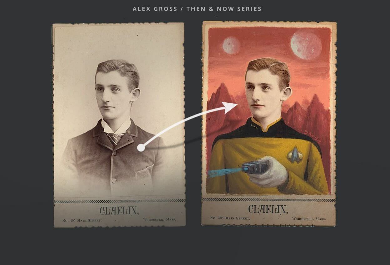 Entre 2008 e 2012, Alex Gross passou um bom tempo dedicado a uma atividade bastante peculiar: comprando e pintando 98 retratos antigos. Foi assim que transformou solenes bigodudos e matriarcas no Chewbacca, no Thor ou no Wolverine. A coleção virou o “Now & Then”, um lindo livro de capa dura que você pode pedir lá na Amazon, por módicos 15 dólares. Se quiser investir um pouquinho mais, por 150 dólares você compra um Box com os prints.