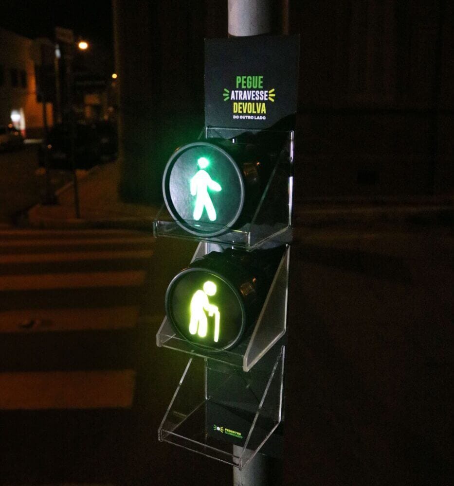 Quem me mandou essa foi meu xará, Wagner Kurt, que está testando essa iniciativa simples e eficiente. Durante a noite, o pedestre pode pegar uma lanterna sinalizadora, atravessar com segurança e simplesmente devolvê-la do outro lado da rua.
