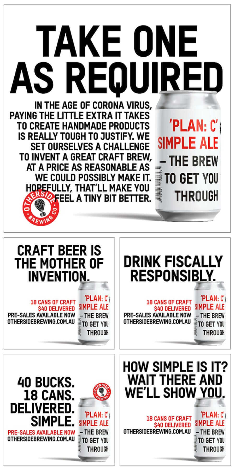 A Cervejaria australiana Otherside Brewing Co. e a agência Block criaram a “Plan C: Simple Ale” (Plano C: Uma Ale simples). Ela foi concebida especialmente para estes tempos difíceis de Coronavírus, quarentena e bares fechados: apesar de ser artesanal, a cervejaria fez de tudo para mantê-la o mais barato possível (só US$1.22), para você não precisar ter que tomar as cervejas sem personalidade dos grandes fabricantes.