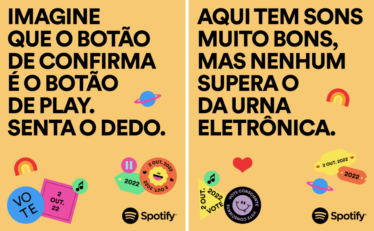 Por meio de mensagens no aplicativo e nas redes sociais oficiais do Spotify no Facebook, no Instagram e no Twitter, além de mídia out of home (OOH) na cidade de São Paulo, os jovens recebem aquele empurrãozinho para pesquisar e se informar sobre os candidatos aos cinco cargos em disputa: presidente da República, governador, senador, deputados federais e deputados estaduais.