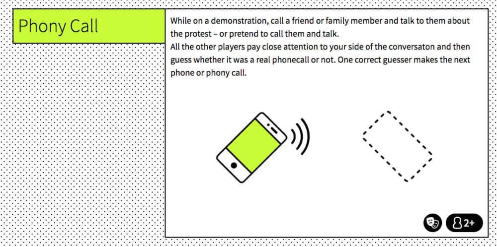 O “Phony Call” é um exemplo: joga-se de dois ou mais players; você deve pegar seu celular e ligar para um familiar ou amigo para falar sobre um protesto. os demais players devem prestar atenção na sua fala e então tentar adivinhar se foi uma ligação real ou não. Quem acerta, faz a próxima ligação.