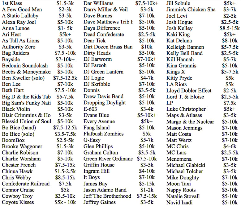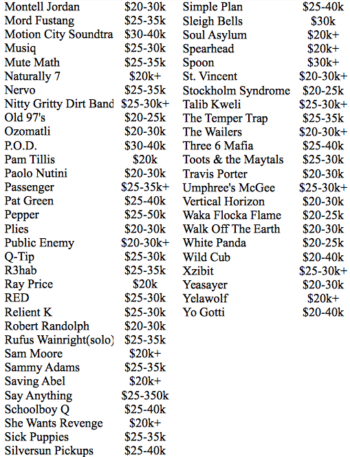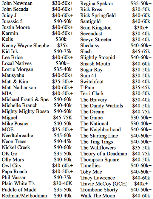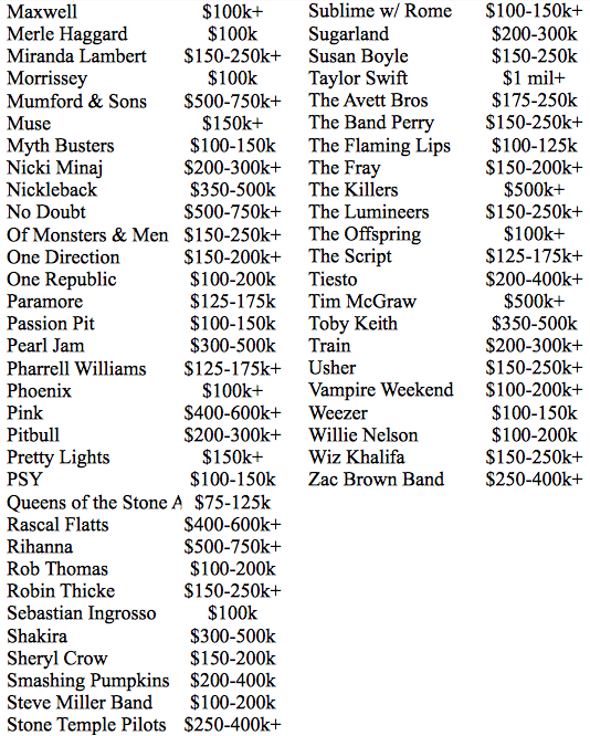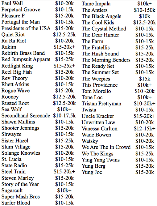 A lista abaixo traz o cachê dos mais populares em atuação pelo planeta, segundo a Degy Entertainment, uma empresa especializada em festivais, principalmente entre o target univesitário. Os números não são precisos, os valores têm as comissões embutidas, e cada artista e agente negociam cachês de acordo com uma infinidade de outros fatores. Mas dá para ter uma ideia de um valor médio cobrado por uma banda famosa e qual o patamar em que cada uma atua. Ou seja, uma lista que serve para entreter e não como um documento comercial.