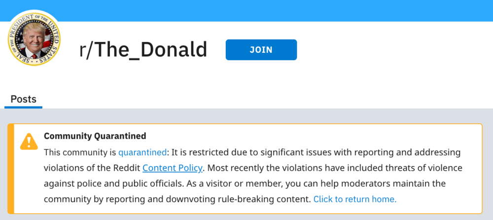 Em junho, a rede social colocou o fórum em quarentena – uma ação que muitas vezes precede uma proibição total e impede que as postagens dos membros cheguem ao público maior do Reddit – em resposta aos membros que fizeram declarações para incitar a violência em conexão com uma manifestação republicana no Oregon, para impedir que uma lei de mudança climática.