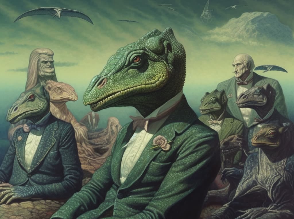 “- Fred, um reptiliano invadiu a reunião! Você não vai acreditar! Ele entrou de olhos fechados no meio da roda e foi direto parar diante da Mônica. Aí ele abriu os olhos de cobra, assustou a geral e soltou uma risada sinistra. Todo mundo saiu correndo!”