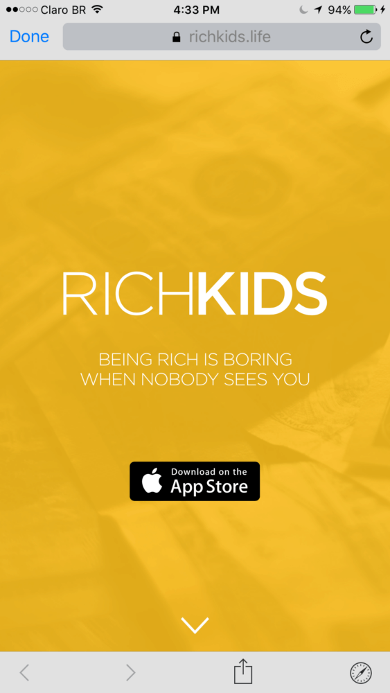 Rich Kids é uma rede que seleciona seus membros da maneira mais óbvia e eficiente: com dinheiro. É tipo um Instagram, uma rede de troca de fotos, só que para poder participar você vai precisar desembolsar mil dólares por mês para poder comparar suas fotos no convés do iate com as fotos dos tigres brancos dos seus amigos.