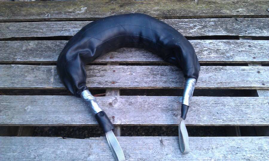 Idealmente, um saco búlgaro de respeito é feito com câmara de pneu de trator ou caminhão, para ficar com até uns 17KG. Mas dá para fazer com câmara de pneu de carro e deixar com a metade desse peso. Sei que a câmara de pneu de bicicleta passou pela sua cabeça, mas isso aqui é um apetrecho de cabra-macho (e cabra-fêmea), não seja ridícul@.